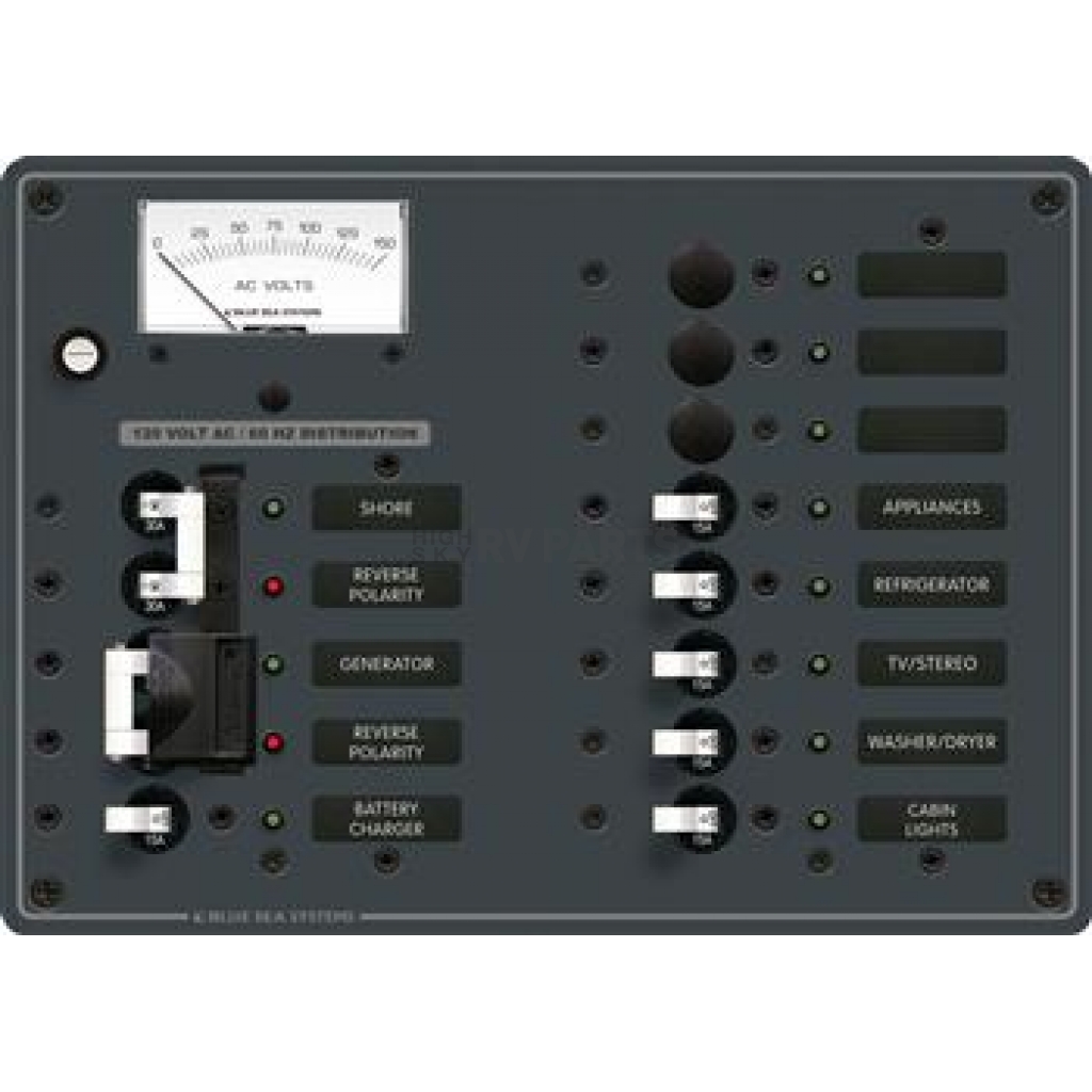 Power Distribution Box; AC Source Selection Circuit Breaker Panel; 120 Volts AC; 30 Amps; Traditional Metal; 2 Sources And 9 Positions; Black; 10-1/2 Inch Width x 7-1/2 Inch Height x 3 Inch Depth; With Basic AC Panel Label Set - 30 Labels/ 11 LED - 120 Volts AC Green/ 2 LED - 120 Volts AC Red/ 6 A-Series White Toggle Circuit Breaker - Single Pole 15 Amps (Branch)/ 2 A-Series White Toggle Circuit Breaker - Double Pole 30 Amps (Main)/ AC Voltmeter - 0 To 150 Volts AC