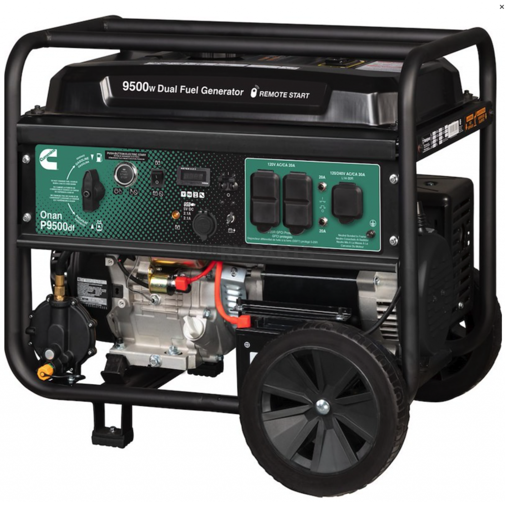 The Cummins Onan is the most powerful generator in our portable generator lineup. Designed in a dual-fuel setup, it runs on gasoline or propane (LPG) with the flip of a switch. Producing 9500 peak Watt and 7500 running Watt of power (using gasoline), it can be used for your camper, jobsite, or as a home backup during power outages. The 13-Horsepower 420 Cubic Capacity OHV 4-Stroke engine is paired with a 6.6-Gallon fuel tank. At 25 Percent load, you can expect 16 hours of run time on gasoline and 8 hours on propane (using a standard 20 Pound propane tank). With the provided remote starter, you can start your generator 99 Feet away, or you can use the onboard push button or pull cord backup.Type: Portable