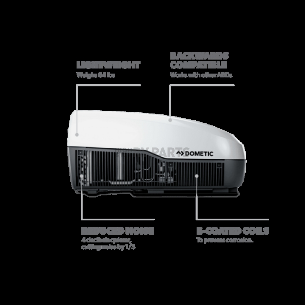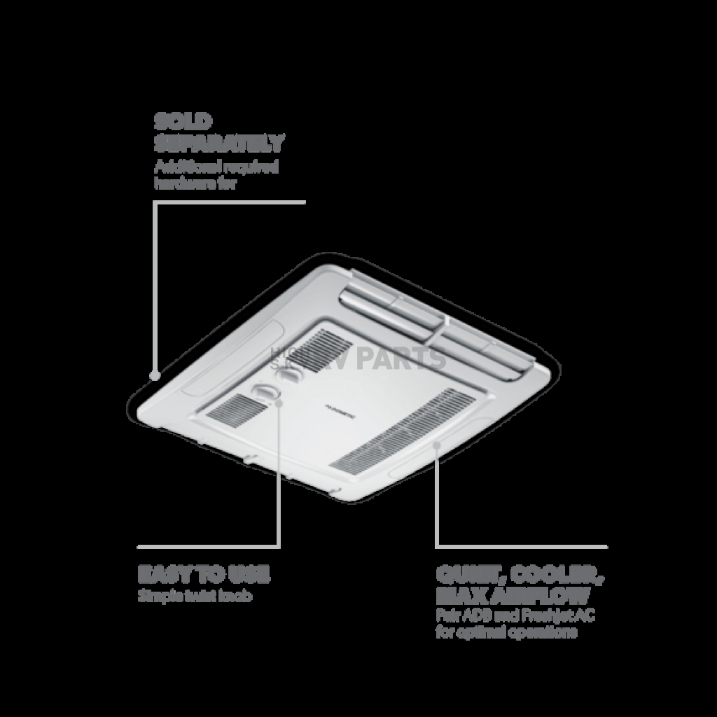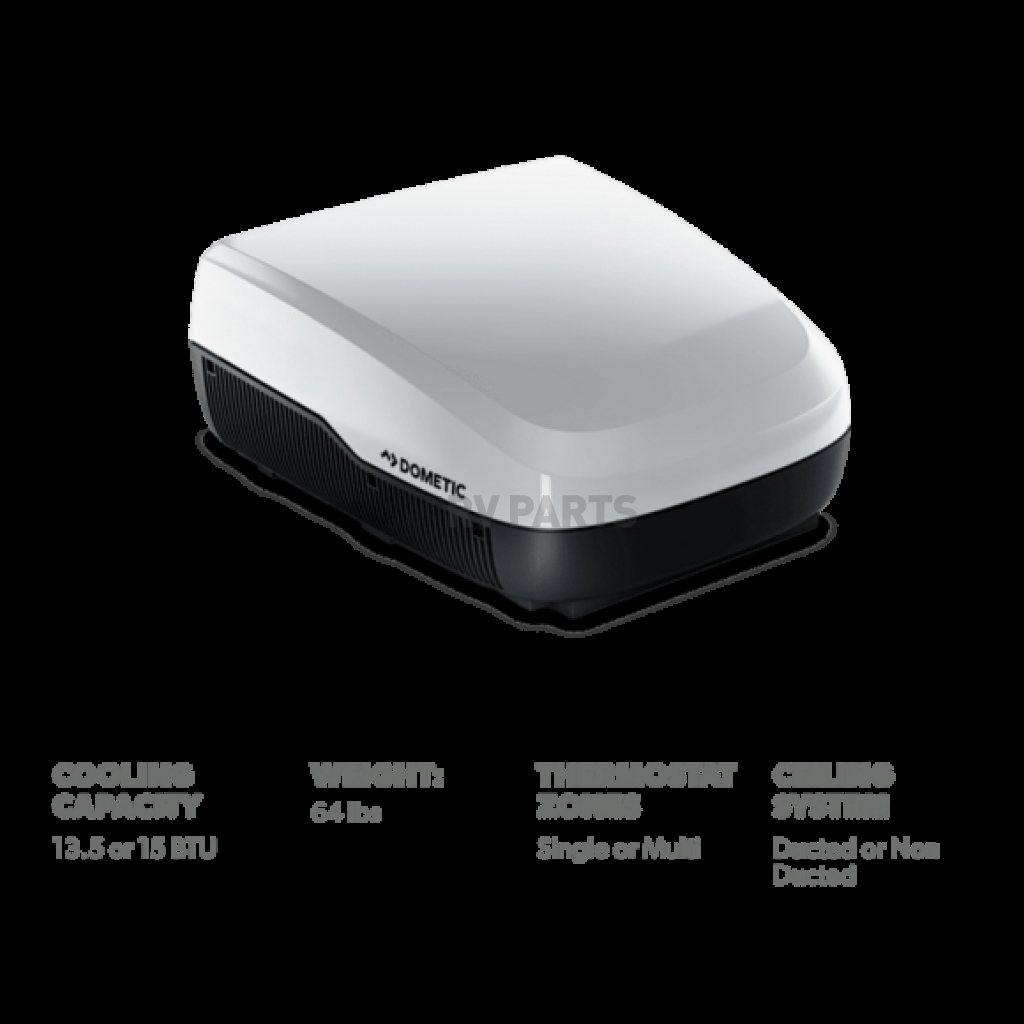 Air Conditioner; FreshJet 3; Fits 14 Inch x 14 Inch Vent Openings; 15000 BTU; Ducted Or Non-Ducted; Polar White; 115 Volt; 13.6 Amp Compressor Draw; Without Heat Pump; Without Condensate Pump; 27-5/8 Inch Length x 29-5/8 Inch Width x 13-7/8 Inch Height; 64 Pounds; Ceiling Assembly Or Wall Thermostat Controls Sold Separately For New Install; Compatible With Existing Dometic Air Distribution Boxes