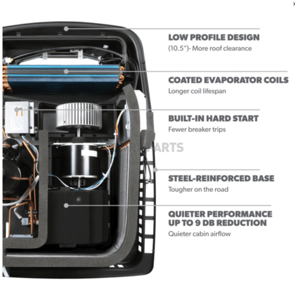 FreshJet 5 is Dometic’s low-profile rooftop air conditioner designed as a direct Penguin II replacement. The approximately 11,000 BTU High Efficiency model offers reliable cooling performance with reduced power consumption. With built-in hard start, quieter operation, and a reinforced steel base, it’s ideal for new RV builds, universal replacements, and upgrades delivering modern comfort without changing the fit.Features
