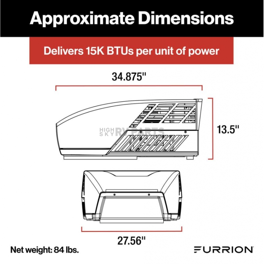 Air Conditioner; Furrion Chill ™ HE; Fits 14 Inch x 14 Inch Vent Openings; 15000 BTU High Efficiency; Ducted Or Non-Ducted; White; 120 Volt; 15.6 Amp Compressor Draw; Without Heat Pump; Without Condensate Pump; 34-7/8 Inch Length x 27-5/8 Inch Width x 13-5/8 Inch Height; 84 Pounds; Ceiling Assembly And Wall Thermostat Sold Separately