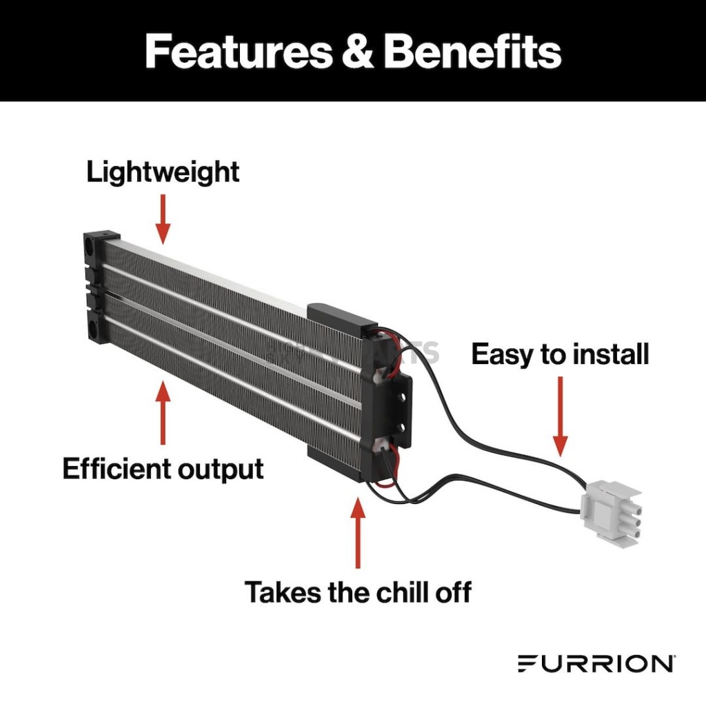 RV climate control without having to power up the gas furnace. This Furrion air conditioner add-on heat strip with 1,500 Watt heating capacity cozies up RV interior temperatures for those crisp mornings or cool evenings. features connecting harness and hardware for ease of installation. Compatible with Furrion Chill Air Conditioner with Manual Air Distribution Box.Features