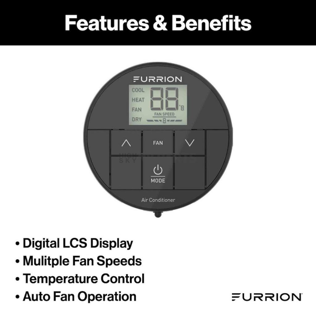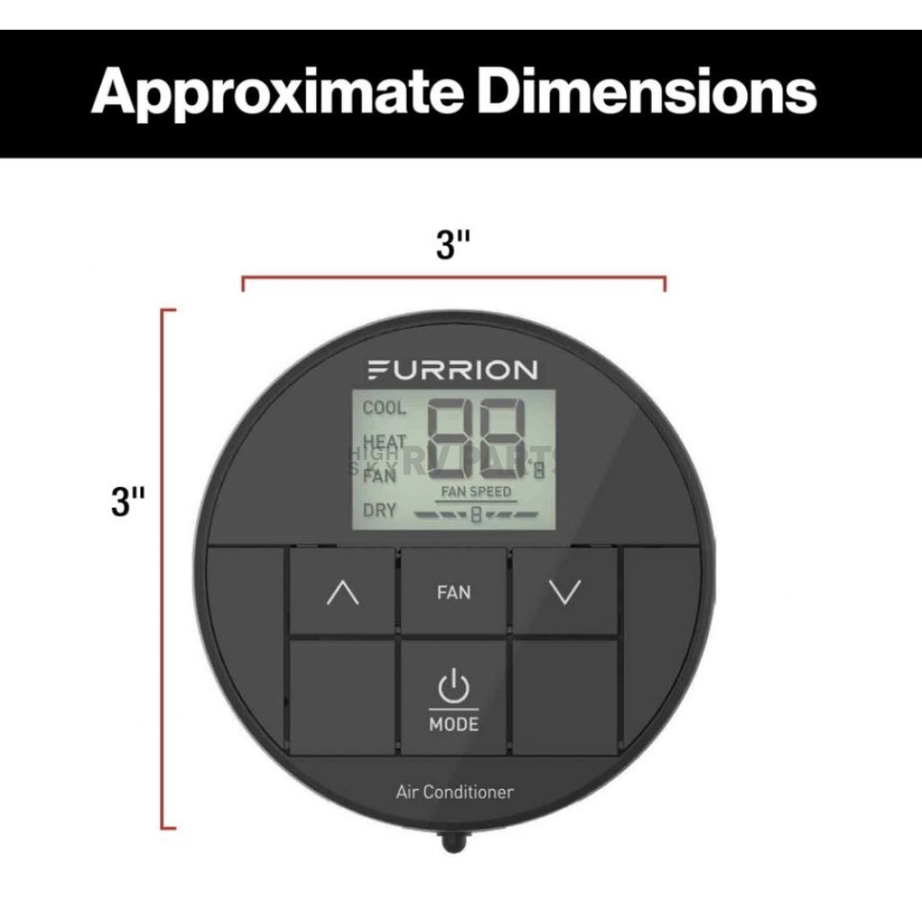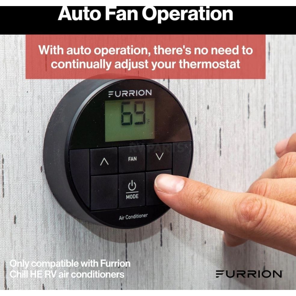 Wall Thermostat; Furrion Chill ™; Use With Furrion Chill ™ R32 Air Conditioners; Single Zone; Heat/ Cool; Programmable; Backlit LED Digital Readout; 12 Volt DC; 3 Inch Diameter x 1 Inch Depth; With High/ Low Fan Speed Control; With Fan On/ Auto Mode; Black