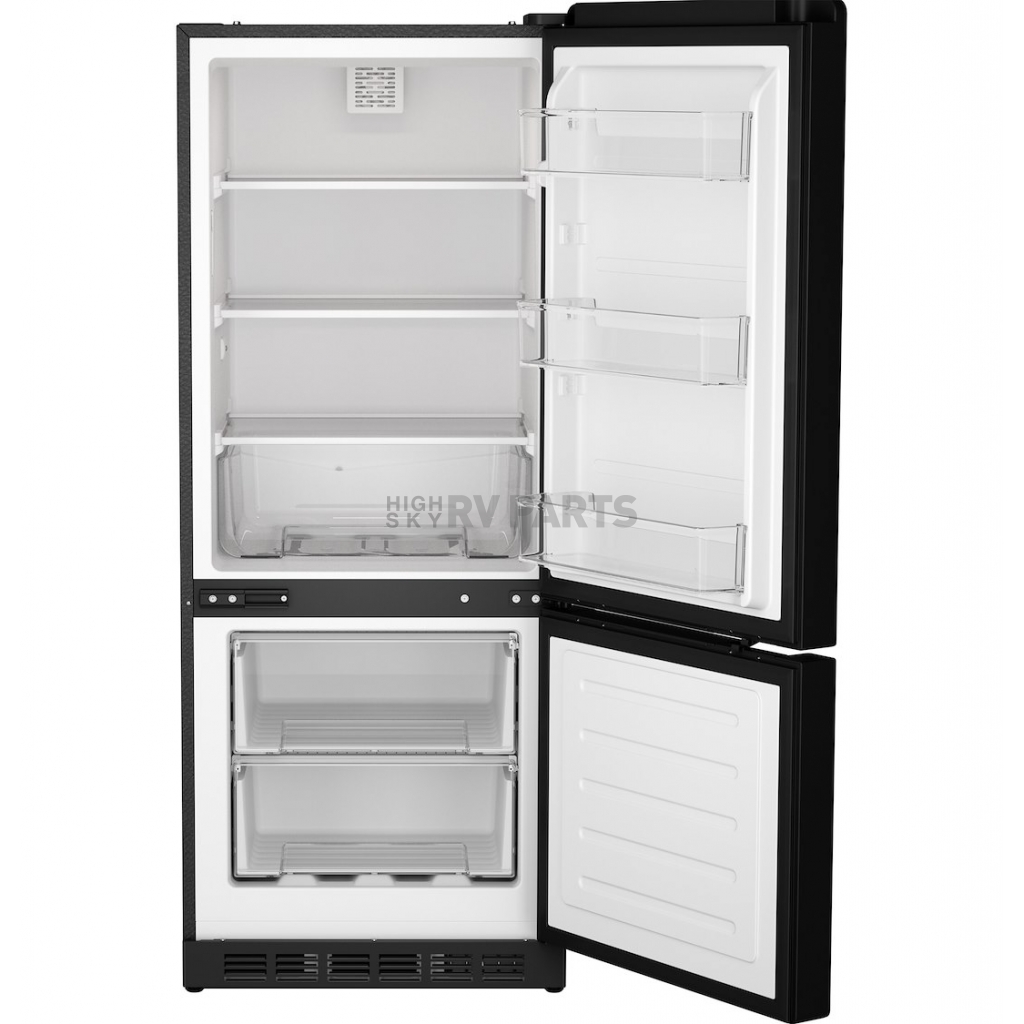 Designed specifically for use in RVs, this innovative 12 Volt DC bottom freezer RV refrigerator is compatible with both battery and solar power. Enjoy this 12 Volt DC bottom freezer RV refrigerator that offers a residential appearance with cutting-edge fresh food storage that is easy to access even when RV slide-outs are retracted. Revel in plenty of extra space in this maximized design. Three full-width glass shelves provide a flexible solution in this 10 cubic foot refrigerator with bottom freezer. Semi-automatic defrost technology allows for improved battery performance and energy savings when compared to traditional RV freezer defrost cycles. This inventive 12 Volt DC bottom freezer design includes glass refrigerator shelves, clear door bins and clear crisper drawers for optimized organization and clear visibility. Refrigerator installation has never been easier thanks to a unique design that requires no external ventilation and zero clearance because of a bottom ventilation design. LED lights fully illuminate the entire interior for advanced visibility of all your fresh foods. Enjoy the freshest fruits and vegetables thanks to innovative crisper drawers that help optimize food preservation. Factory-installed door pocket handles offer an integrated design and function as refrigerator safety latches to keep doors securely closed when in motion. Durability tested compressor and interior fan for increased cooling performance and dependable operation. An easy-access refrigerator on/off switch makes it simple to turn off and manage power usage when the appliance is not in use. The Turbo Cool Setting quickly lowers the refrigerator's interior temperature by circulating an extra boost of cold air. When activated, it runs the refrigerator's compressor and fans non-stop for about 8 hours, effectively cooling the refrigerator compartment at a rapid pace.Capacity: 10 Cubic Feet