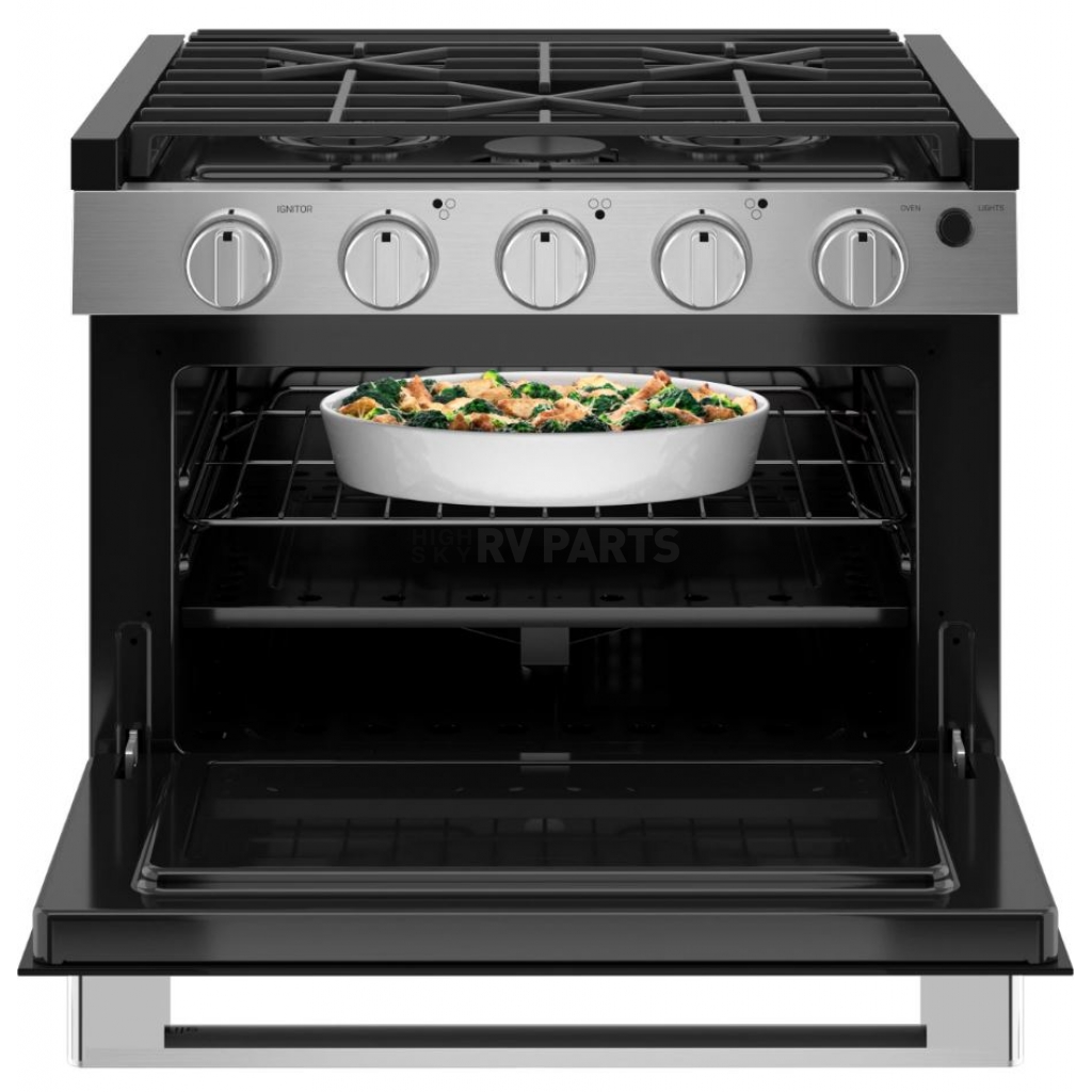 Discover how this 17 Inch drop-in RV stove fits perfectly into your camper for easy on-the-go cooking. Conveniently use your 12 Volt DC range with your RV's 12 Volt system for power thanks to this hardwired range. Fully contain liquid propane in your RV for easy mobile cooking on your propane gas range. Easily light each burner by simply turning on the burner and creating a spark with the spark ignition knob. White backlit range knobs can conveniently be turned on and off for easy visibility any time of day. These cast metal knobs offer the feel, fit and finish of stainless steel without sacrificing the durability of RV range with heavy duty knobs. This durable and fully adjustable nickel rack has 2 flexible oven rack positions to accommodate a variety of cookware. The glass range top cover has rubber feet on the bottom to fit perfectly and silently on the grates during transport. Use it as a cutting board or for extra countertop space while cooking.Type: Cooktop