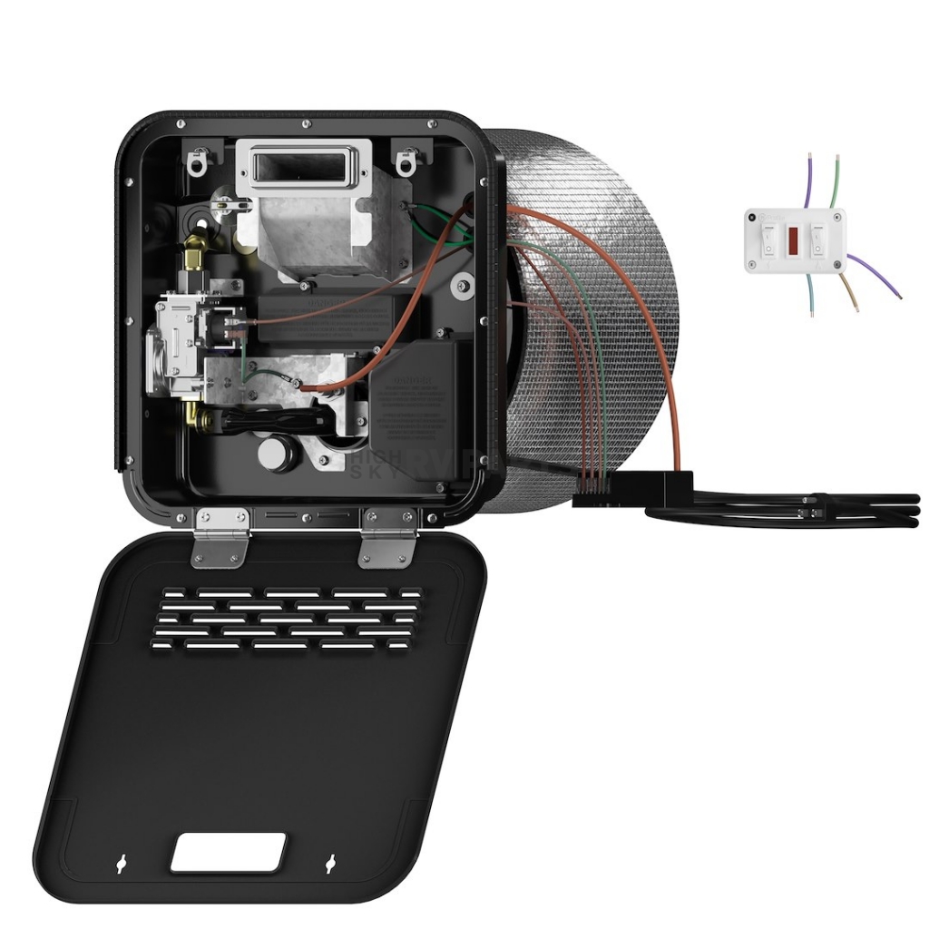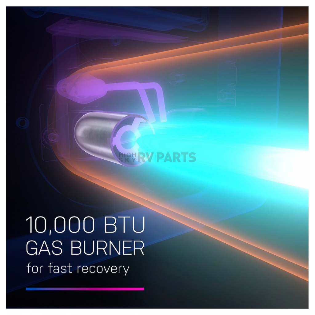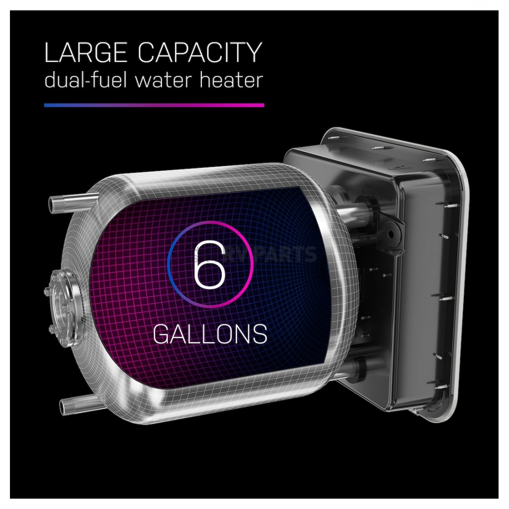 This intelligent design allows you to easily replace your existing 6 gallon water heater with a solution that fits RV water heater standard cutout. Maximize your capabilities with this large RV water heater that is rated at a 6 gallon capacity for plenty of hot water whenever you need it. Operate the gas and electric heating options simultaneously or independently thanks to this innovative RV water heater with dual-fuel. Heat water quickly and enjoy quick recovery time in this RV water heater engineered with a 10000 BTU gas input burner. 1440 Watt Stainless Steel heating element offers maximum performance when heating with electricity. Low Watt density heating element increases the lifetime of the element and helps prevent dry fires for a smarter, safer solution. The porcelain enamel tank design streamlines RV water heater maintenance by providing easy access to the anode rod for draining and service. Engineered with increased attention to safety using a fully enclosed control board securely located to protect from exterior elements or interior accidents. This RV water heater features a factory-installed 6 feet cord to allow easy plug-in access into 120 Volt outlets.Capacity: 6 Gallon