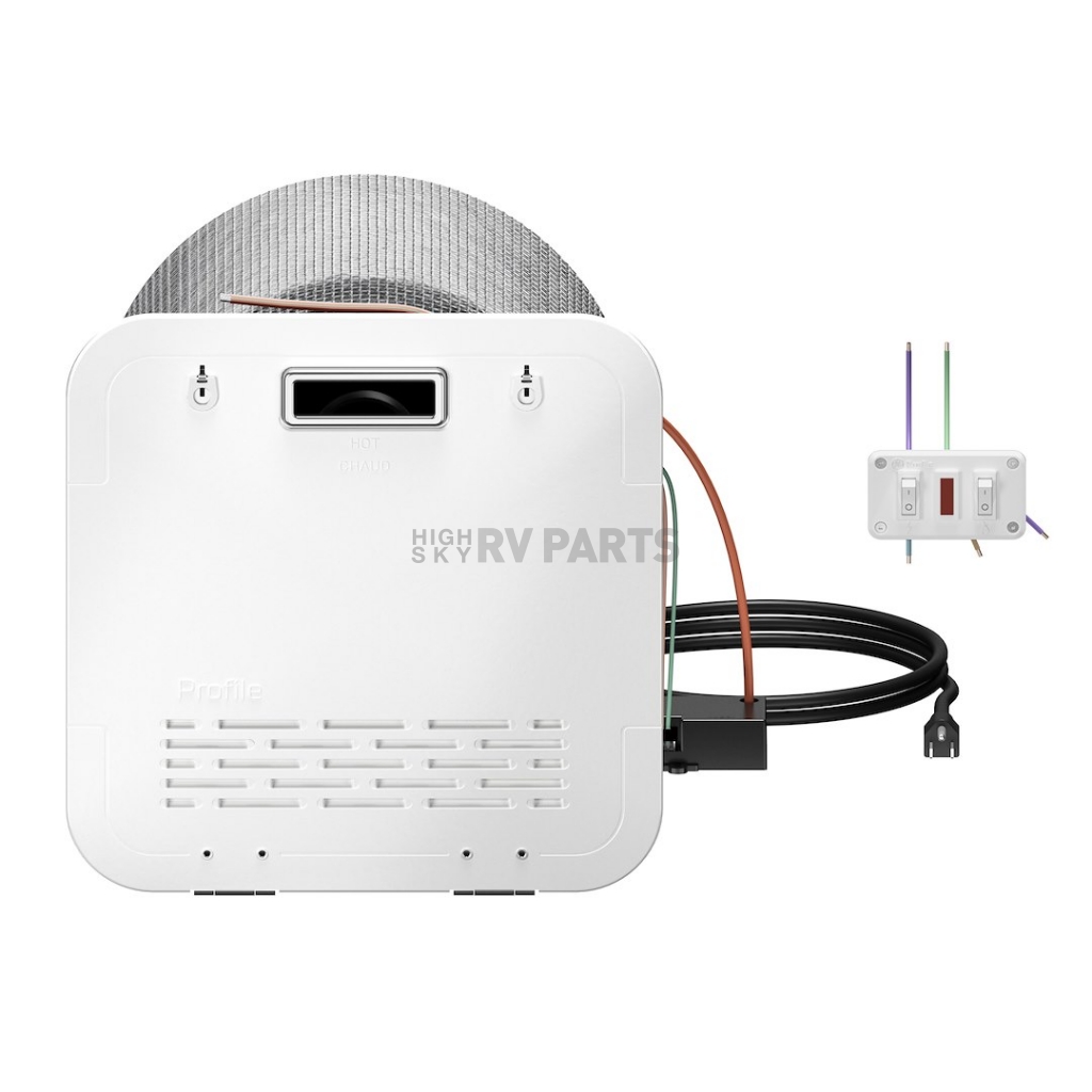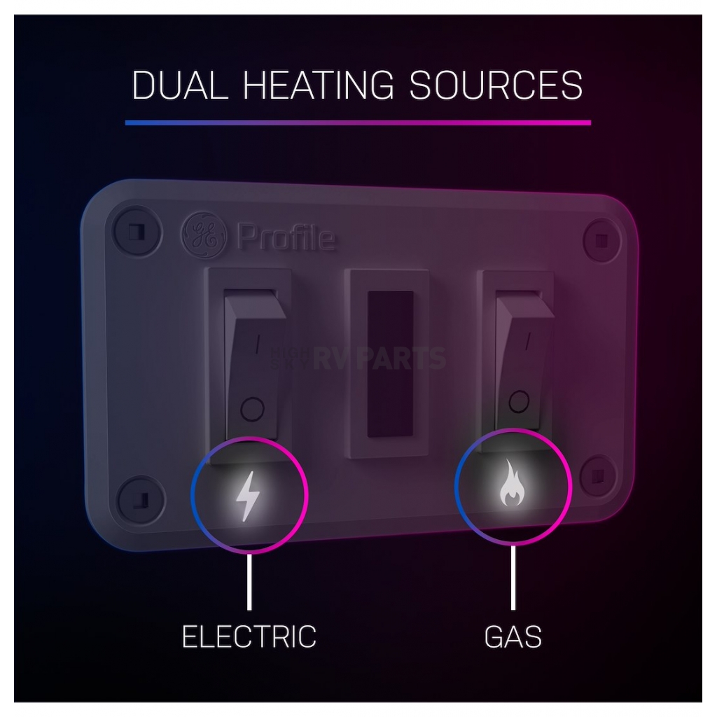 Water Heater; GE Profile™; Gas-Electric; Dual Fuel; 10 Gallon; 1440 Watt; 10000 BTU; 16.7 Inch Width x 16.9 Inch Height x 21-1/2 Inch Depth; 31.3 Pound; Portable; Stainless Steel Heating Elements; Recovery Time: 47 Minutes (Gas)/ 71 Minutes (Electric Only)/ 28 Minutes (Combined)