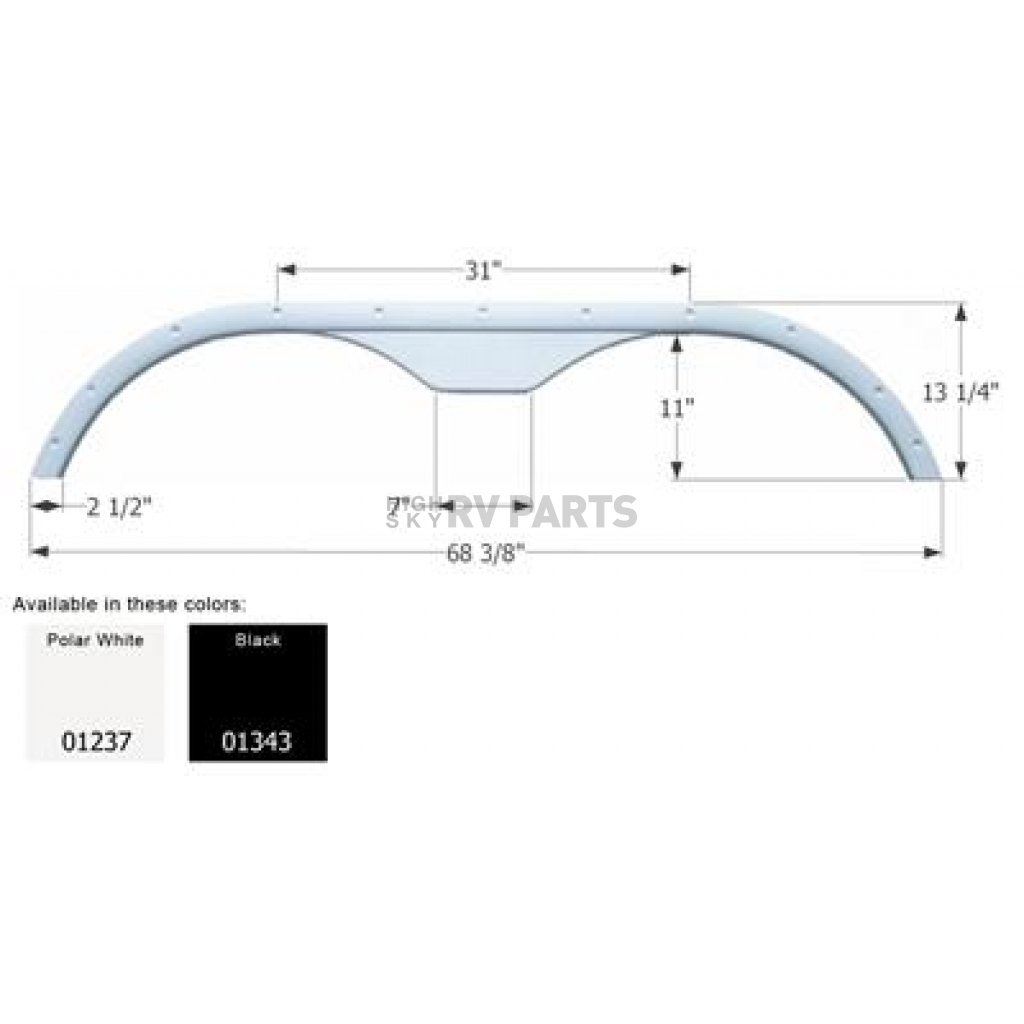 Fender Skirt; Tandem Axle; Fits Various Travelaire Brands Including Rustler And Westwind; 68-3/8 Inch Length x 13-1/4 Inch Height; Polar White; ABS Plastic; Tandem; Single; Use Measurements To Determine Proper Fitment Before Ordering
