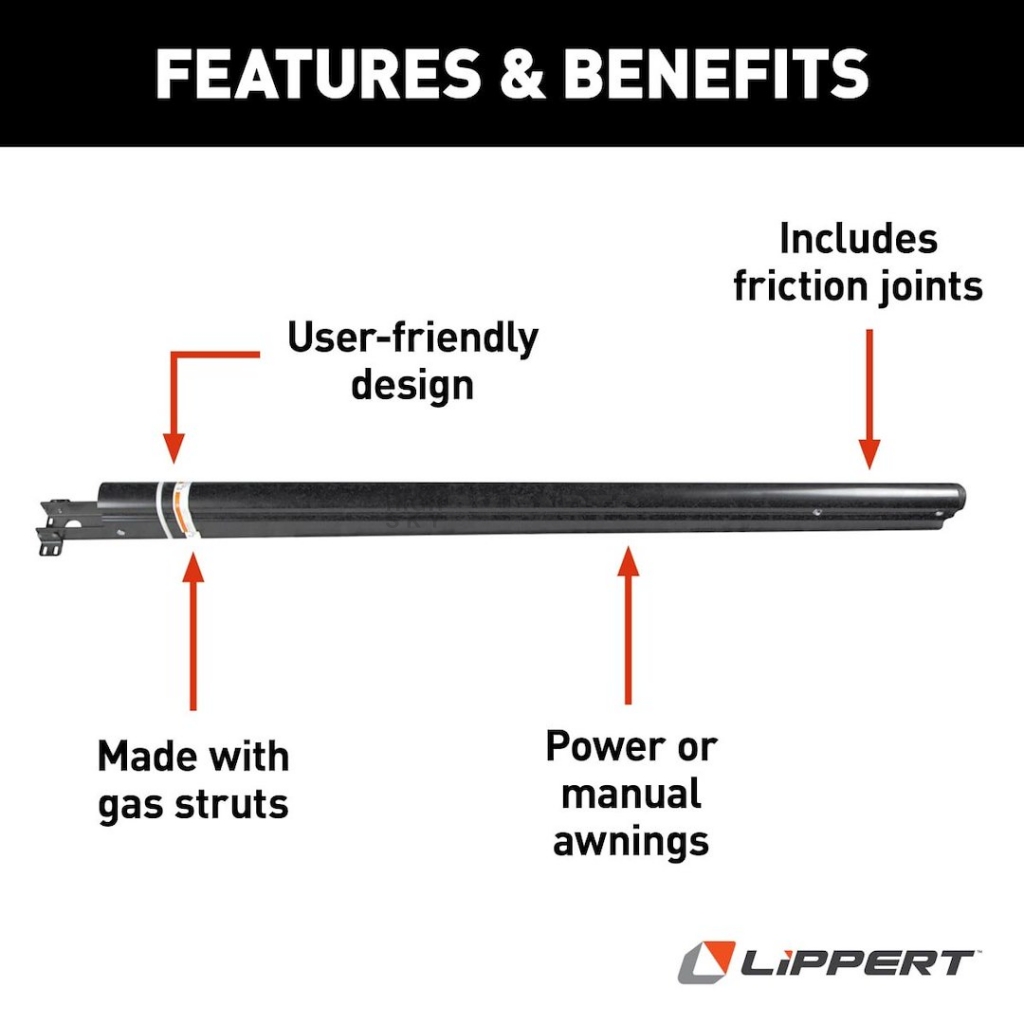 Reliable, functional and durable are a few words that describe the Solera Flat Awning Support Arm Assembly. This innovative awning arm comes complete with a gas strut for stability and effortless awning extension and retraction.Awning Type: RV Patio