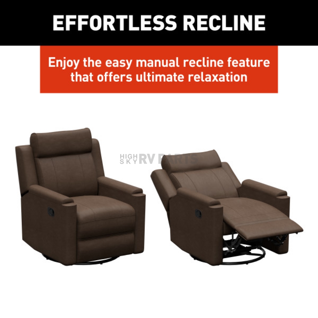 Experience relaxation like never before with the Thomas Payne Signature swivel glide RV recliner. Designed for mobile living, this recliner features an easy manual recline functionality and a smooth swivel and glide mechanism, making it perfect for unwinding after a long day of travel. Built with high-density foam, it provides extra cushioning to ensure your comfort during every adventure.Color: Brown