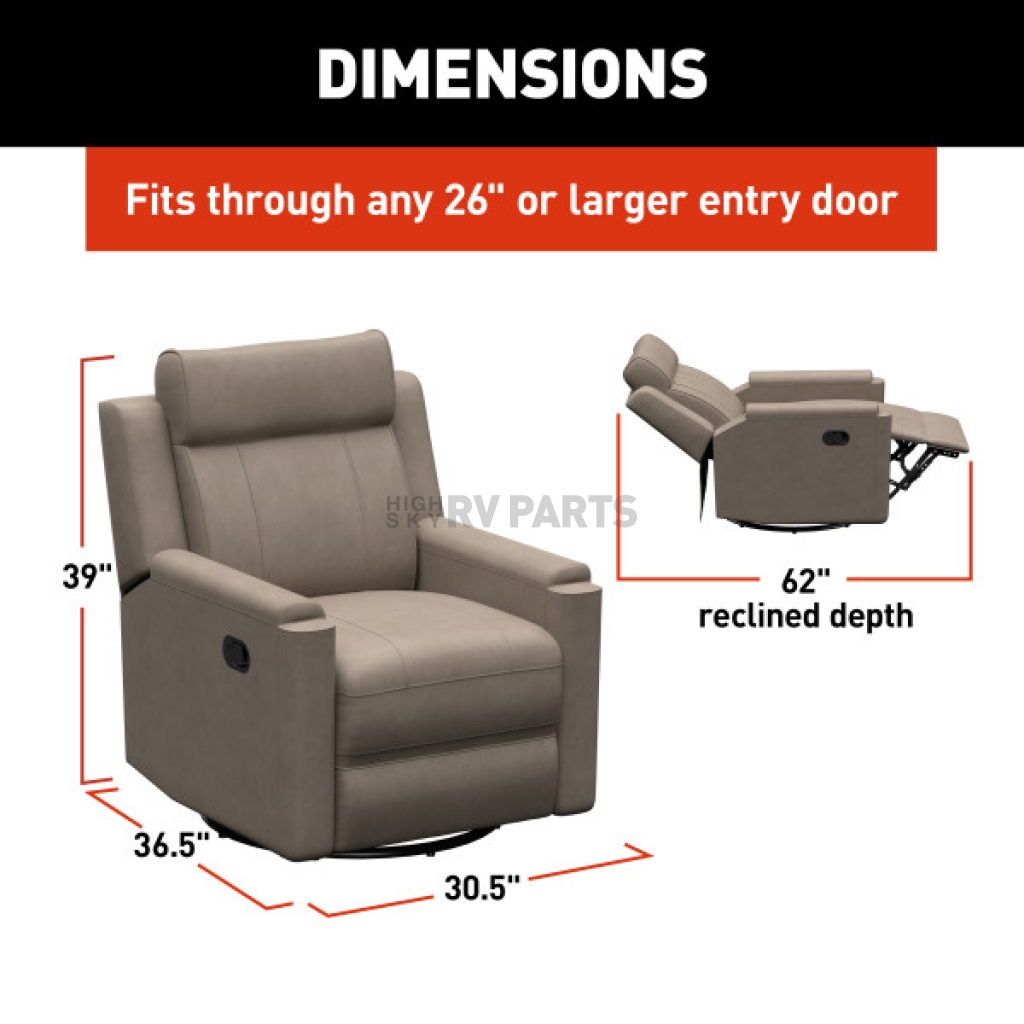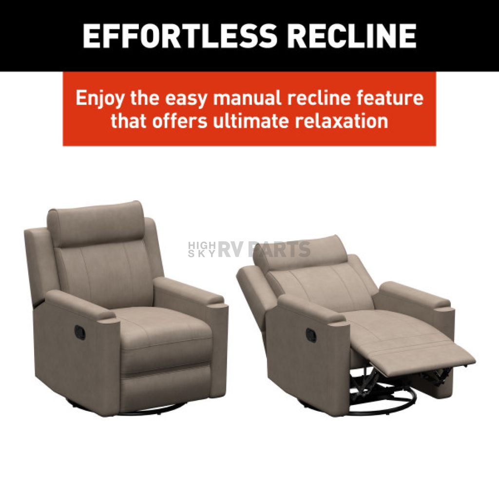 Experience relaxation like never before with the Thomas Payne Signature swivel glide RV recliner. Designed for mobile living, this recliner features an easy manual recline functionality and a smooth swivel and glide mechanism, making it perfect for unwinding after a long day of travel. Built with high-density foam, it provides extra cushioning to ensure your comfort during every adventure.Color: Beige