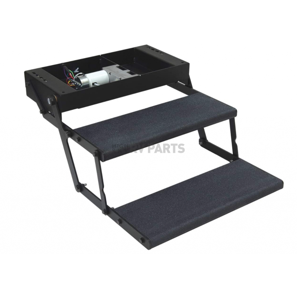 Entry Step; Tread Lite; Double Electric Folding Steps; 24 Inch Width x 8-1/2 Inch Depth; 8-1/2 Inch Rise; Black Powder Coated Steel With Non-Slip Coating; With LED Lighting; With Switch And Wiring Harness