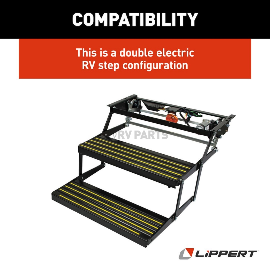 The Kwikee Revolution Double Electric Step by Lippert Components automatically extends when you open your RV door and retracts when you close your RV door. The power step will automatically stop if it strikes an obstacle. Weatherproof wiring and connectors prevent shorts and corrosion in the system.Mounting Type: Coach Mount