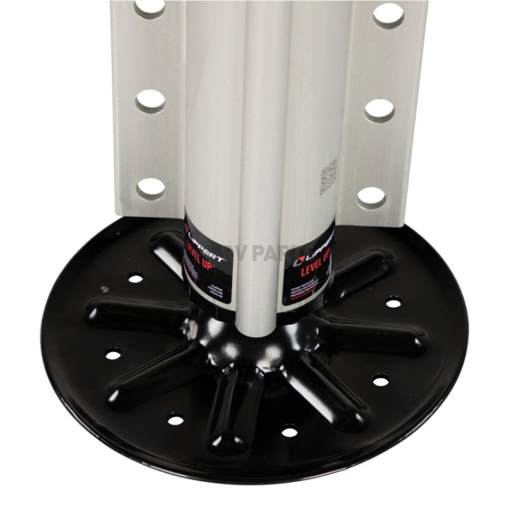 Leveling Jack; Use To Level Motorhome/ Travel Trailer Or Camper While Parked; Hydraulic; 14000 Pound Capacity; Replacement Left Hand Landing Gear Leg For Gen I Lippert Level-Up Leveling System; Aluminum; Clear Anodized Finish; With 6 Mounting Holes; With 9 Inch Round Black Footpad