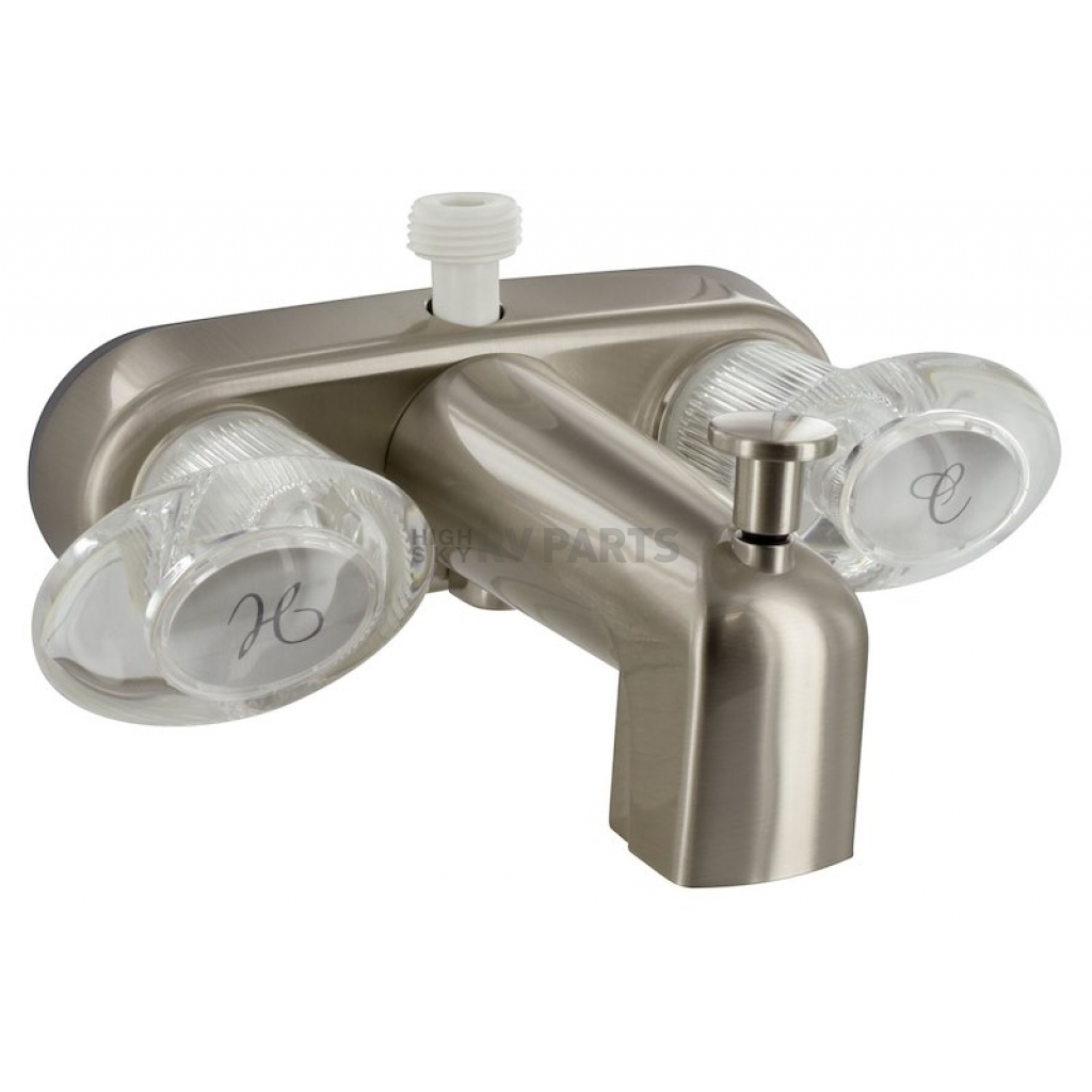 Faucet; Catalina; Used For Lavatory; Single Piece 4 Inch Wall Mount With Tub/ Shower Diverter; 2 Acrylic Lever Handle; Brushed Nickel Plated/ Plastic Underbody; 2 Hole Application; 1/4 Turn Washerless Valve; With D-Spud To Attach Hand Held Shower; With Individual Box