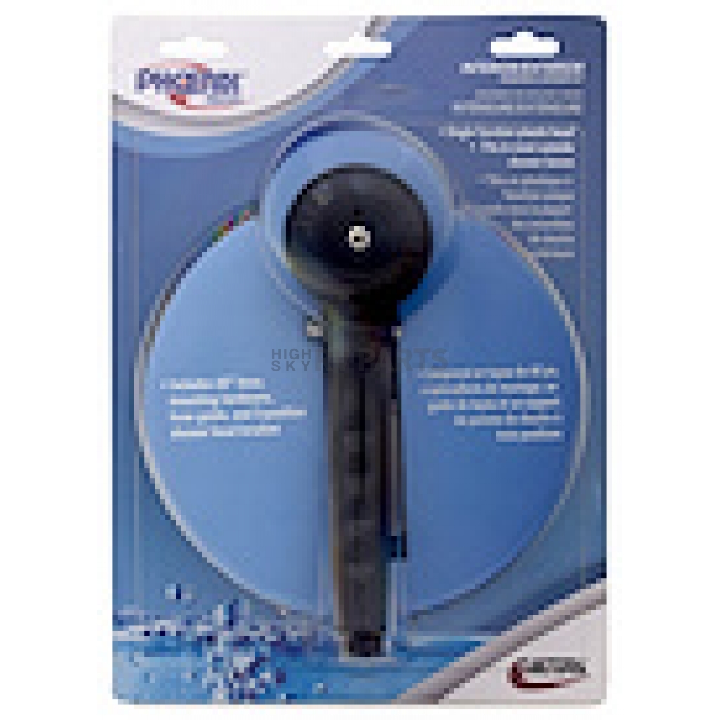 Shower Head; Hand-Held With 60 Inch Vinyl Hose; For Interior/ Exterior Shower; Single Function Spray Setting; With Trickle Shut-Off; Black; Plastic; With Hose Guide Ring/ 3 Position Shower Head Bracket/ Mounting Hardware; With Blister Package