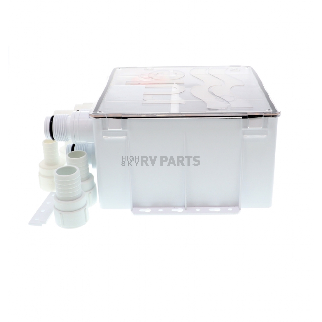 Marine Gray Water Sump; Use To Keep Boat Clear Of Grey Water; 800 GPH; 24 Volt DC; 9-1/2 Inch Length x 9 Inch Width x 5 Inch Height; 3/4 Inch; With Back Flow Prevention; With Pump/ Strainer/ Float Switch And Rear Mounting Bracket