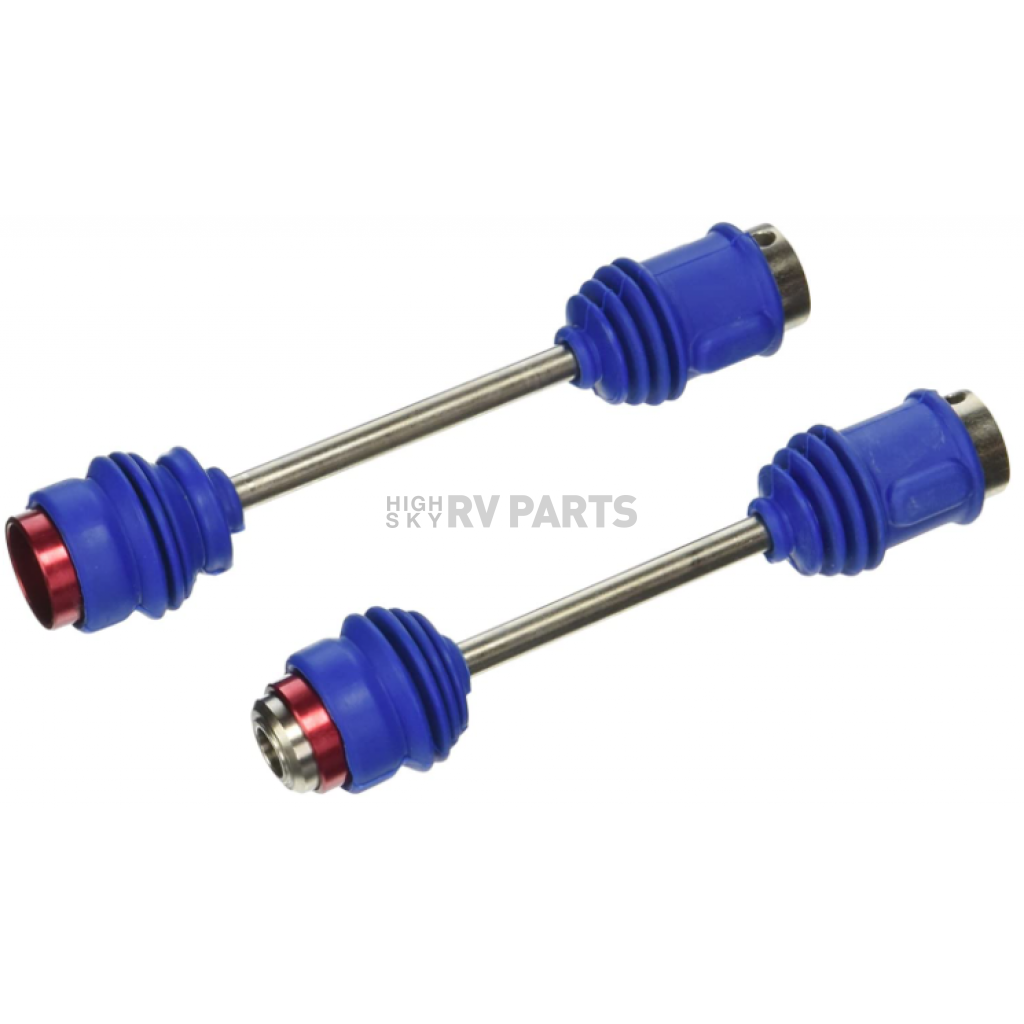 Remote Control Vehicle Drive Shaft; For Use With TRAXXAS E-MAXX Remote Control Vehicles; Assembled With Lubricated Inner And Outer Blue Silicone Dust Boots; One Center/ Front And One Center Rear; Two Nickel Plated Steel Shafts; U-Joint Pins Held Together By Lightweight Aluminum Sleeve For Secure Pin Retention; Red Anodized Aluminum Accents
